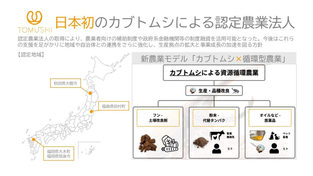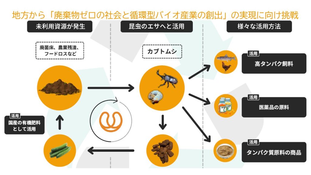 当社は、カブトムシを通じた地域内の資源循環ビジネスを展開する秋田県発のスタートアップです。 独自技術により、従来廃棄されていたキノコ菌床や生ゴミなどの未利用資源をカブトムシのエサに活用し生育・販売する事業のフランチャイズ展開を行うほか、生育過程で発生する幼虫の排泄物の有機肥料化や高タンパクなカブトムシ幼虫を飼料原料として活用するなどの取り組みを進めています。さらに、子ども向けの昆虫イベントを通じた環境教育にも力を入れています。 また、地域内での資源循環による環境保全や農業振興をはかるべく、全国の自治体との連携を進めています。2025年10月、「広域認定農業法人(注)」として農林水産大臣から認定を受け、秋田県大館市、福島県田村市および福岡県筑後市・三猪郡大木町にカブトムシの生育拠点拡大を計画しています。
